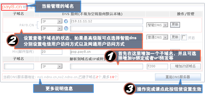 | 以下操作均以pay8.cn做为示例域名,请操作时结合自己的域名 域名申请成功后,默认有www.pay8.cn,pay8.cn两个域名设置记录,以及一个泛域名设置记录。 1、如果要设置pay.cn/www.pay8.cn的解析,请在对应的文本框中输入解析的ip地址,或者选择cname以及转发等分别设置 2、泛域名设置,要设置泛域名解析,请勾选泛域名记录行后的“开启”复选框即可设置泛域名功能 3、要设置其它的子域名,请在最下的文本框输入子域名,并选择解析或者转发等,再设置好具体的地址后点“增加子域名”按扭既可增加成功,也可在增加成功后修改解析或者转发地址。 4、高级版本的DNS管理系统具有智能DNS解析功能,增加子域名后,既可选择智能DNS功能,此时同一个子域名就有“电信”和“网通”两个不同的设置选项,您可以有针对的分别设置。 |